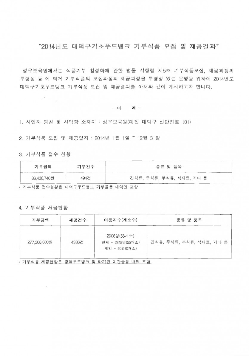19-03-28 11:21 2014년 대덕구기초푸드뱅크 운영실적(기부식품 모집 및 제공결과) 페이지 정보 작성자 성우보육원 댓글 0건 조회 5,606회 본문 2014년 대덕구기초푸드뱅크 운영실적(기부식품 모집 및 제공결과) 을 게시합니다. 목록 댓글목록 댓글목록 등록된 댓글이 없습니다.