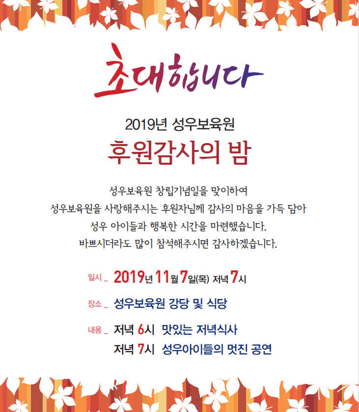 19-10-24 14:59 (초대합니다) 2019년 성우보육원 후원감사의 밤 (11월 7일 오후7시) 페이지 정보 작성자 성우보육원 댓글 0건 조회 5,328회 본문 2019년 성우보육원 후원감사의밤 많은 참석부탁드립니다! 목록 댓글목록 댓글목록 등록된 댓글이 없습니다.