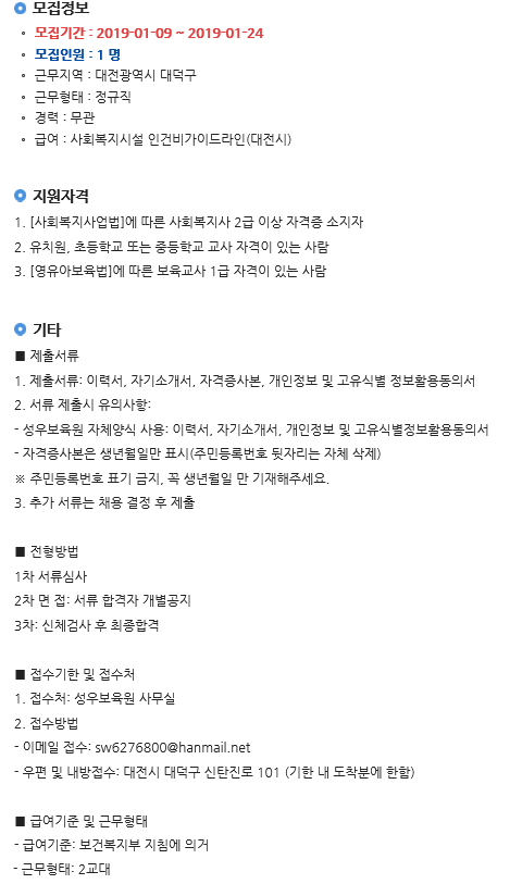 19-03-28 11:48 (공고) 생활지도원 모집 페이지 정보 작성자 성우보육원 댓글 0건 조회 5,781회 본문 생활지도원 모집 ※ 접수된 서류는 일체 반환치 않음 복지넷(https://www.bokji.net/job/off/01_01.bokji)의 첨부문서 활용 목록 댓글목록 댓글목록 등록된 댓글이 없습니다.