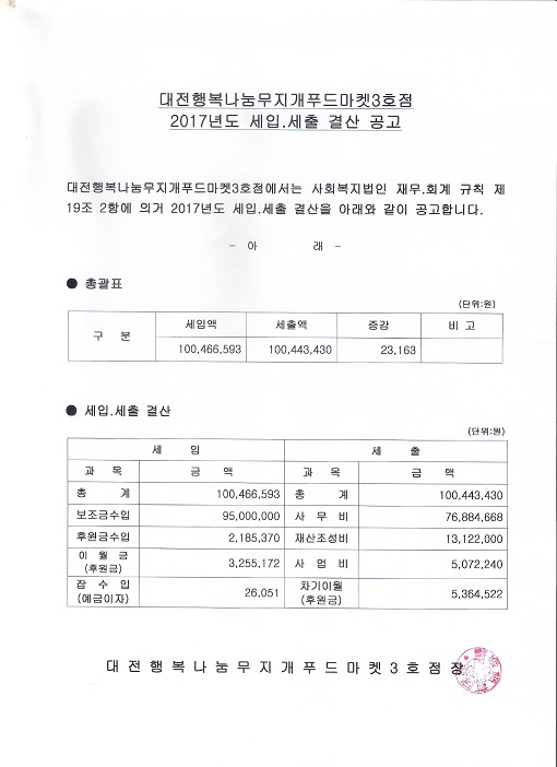 19-03-28 11:44 (공고)대전행복나눔무지개푸드마켓3호점 2017년도 세입.세출 결산 페이지 정보 작성자 성우보육원 댓글 0건 조회 5,457회 본문 (공고)대전행복나눔무지개푸드마켓3호점 2017년도 세입.세출 결산 목록 댓글목록 댓글목록 등록된 댓글이 없습니다.